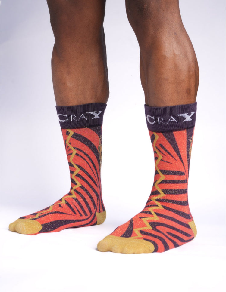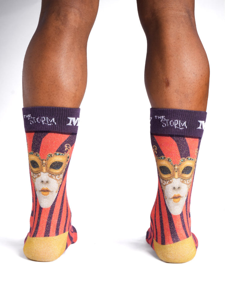 When Tammy McCray joined forces with RoryThe Storm Holmes on TIKTOK back in June 2023, we knew that something extraordinary would come from it.  Both of us are on a mission to empower men to be unapologetically themselves while standing tall and being confident within.  Rory's nickname is "TheStorm" so it was a no brainier on  the theme of the sock. Do you know what’s up with a storm? It is a force of nature (just as every human is a force of nature) that clears the path and tears off all the masks. Allows us to finally embrace our truth. There are no lies in the face of a storm. Henceforth a mask was placed on the back of the sock in the midst of the storm as a symbol of empowerment and standing up to whatever life's storms may throw your way. So it is my pleasure to present to you: THE CRIMSON STORM ART SOCK! With its red-orange and eggplant purple swirls, metallic gold throughout these socks are definitely a work of art!